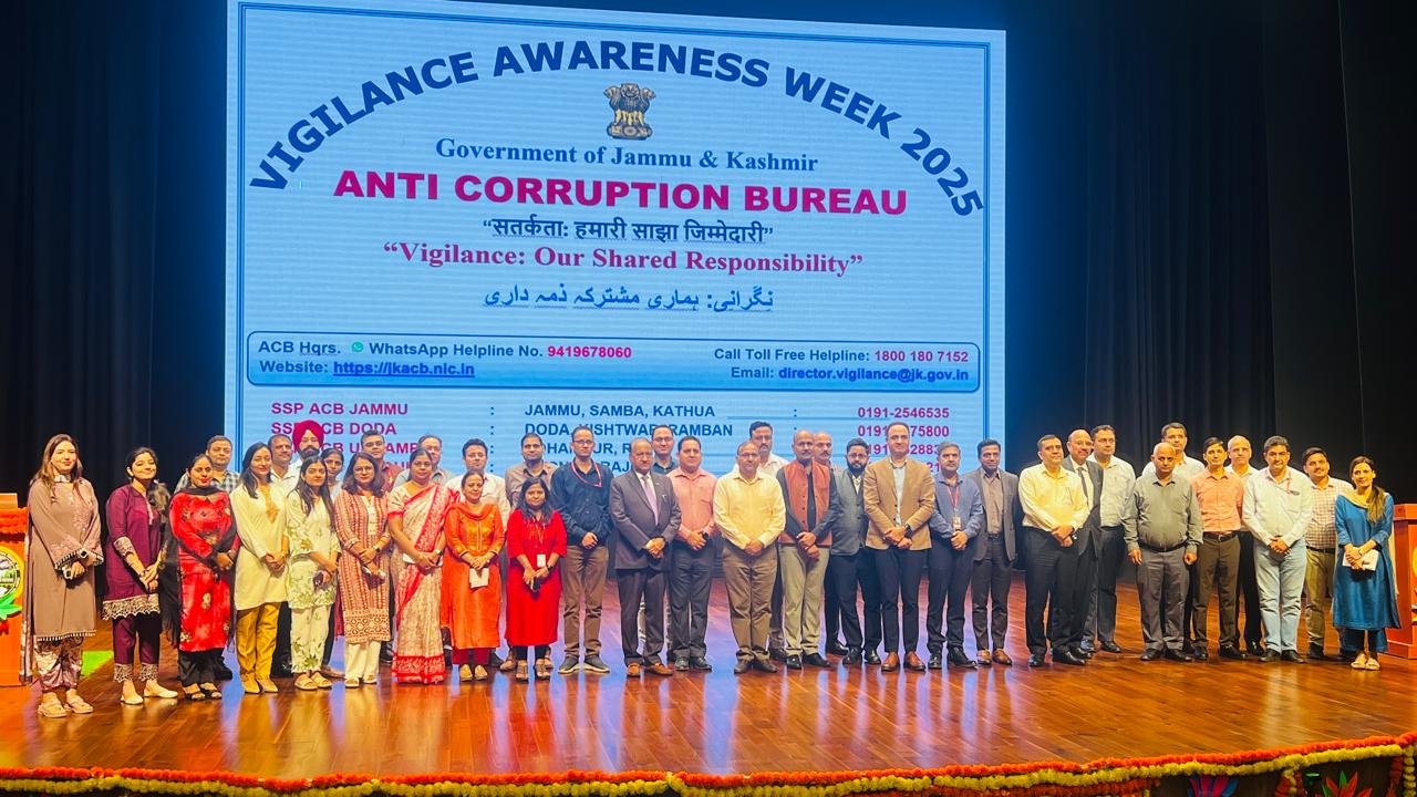 The events and programs have been effectively conducted covering venues at AIIMS Jammu, Government Hospital Gandhi Nagar Jammu, GMC Rajouri, DC Office Doda, DC Office Udhampur, in Jammu Division and GMC Srinagar, GMC Handwara, GDC Pulwama, DC Office Ganderbal, Mini Secretariat Shopian,, PHC, Bagi-e-Islam Baramulla, DC Office Bandipora, DC Office Budgam, BMO Office Pampore, Mini Secretariat Kulgam and Dak Bungalow Anantnag, in Kashmir Division. A dedicated Vigilance Awareness program was also organizer by EOW Wing of ACB, at SKUAST Shalimar. ACB Officials, on invitation of CRPF -53 BN, also attend a vigilance awareness program at DPL Baramulla.